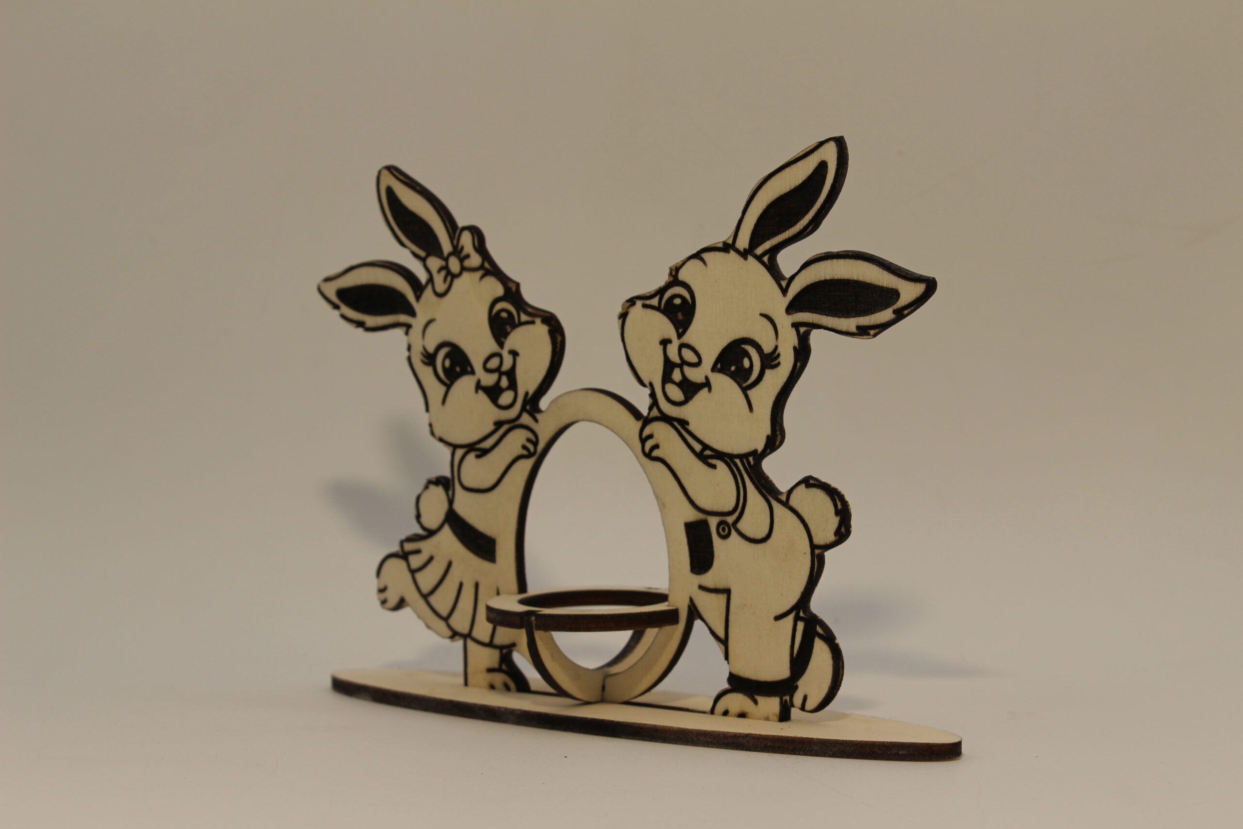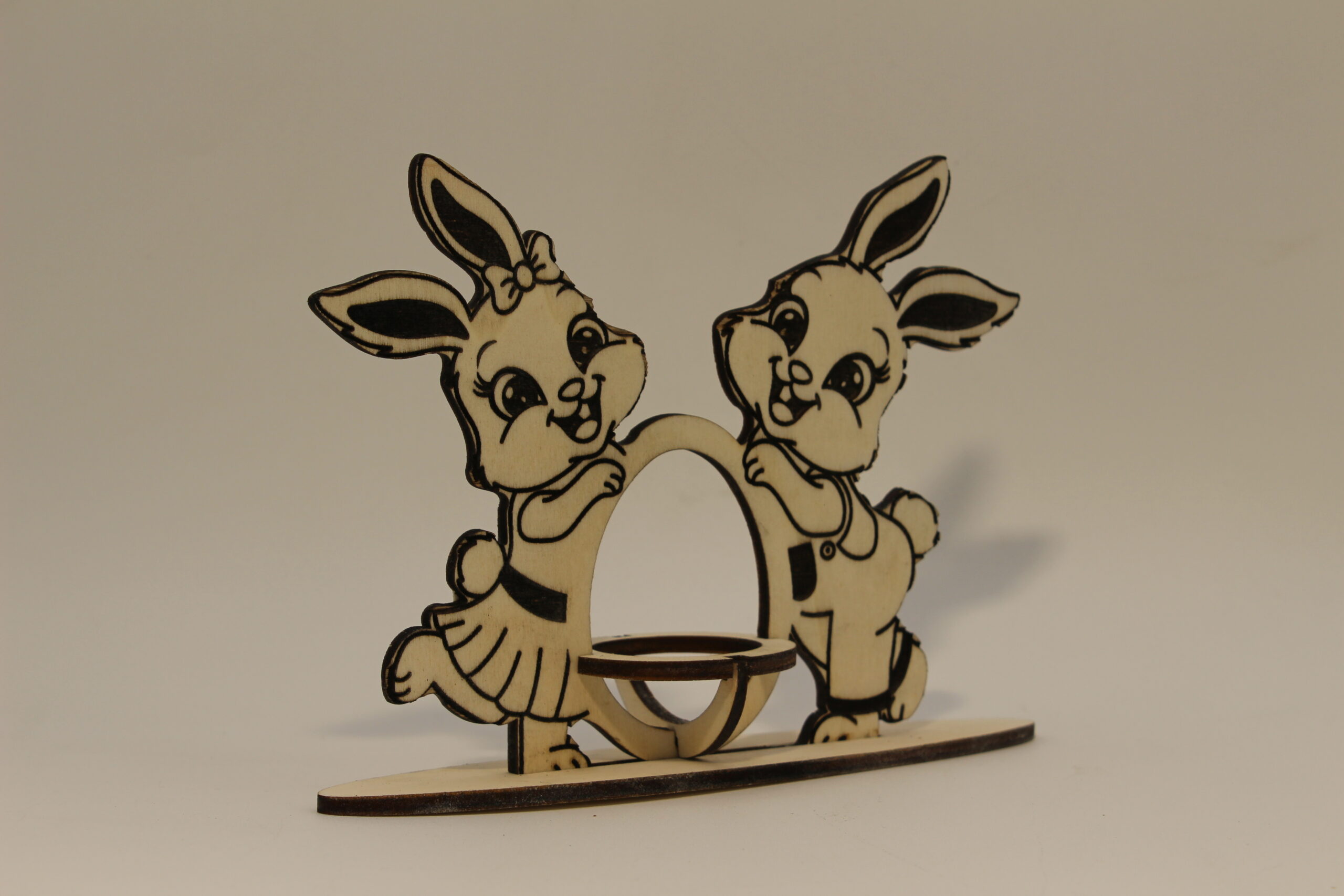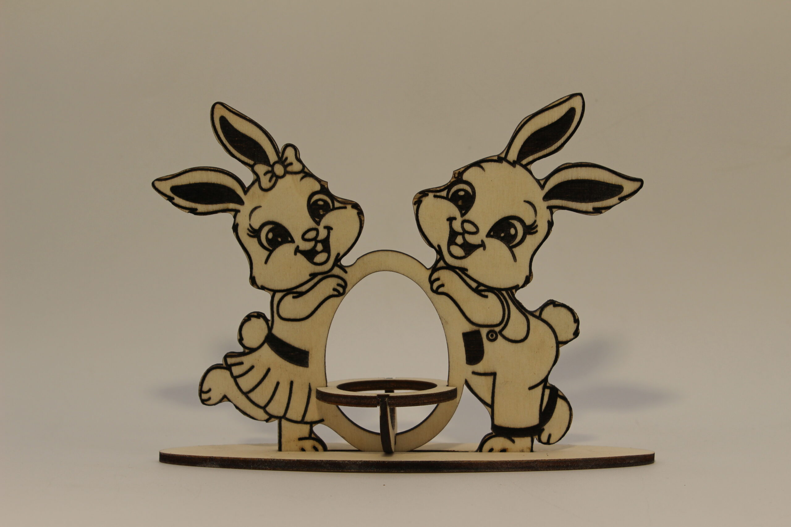 Craquez pour ce joli duo de lapinettes décoratives en bois, plein de tendresse et de complicité. Finement découpées et gravées, elles entourent un support central idéal pour accueillir un œuf ou une petite décoration, parfait pour sublimer votre table de Pâques ou votre intérieur printanier.
