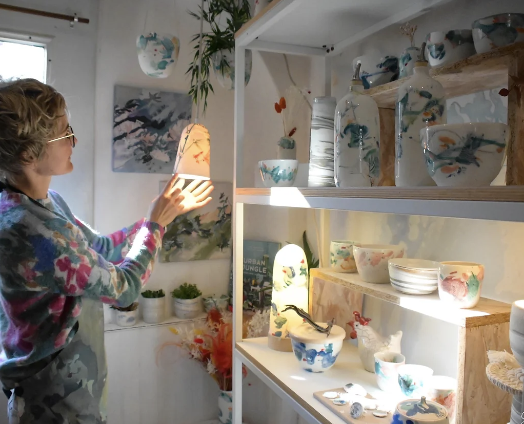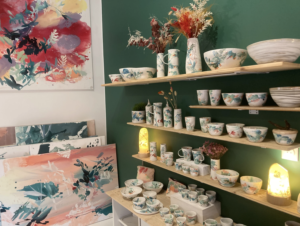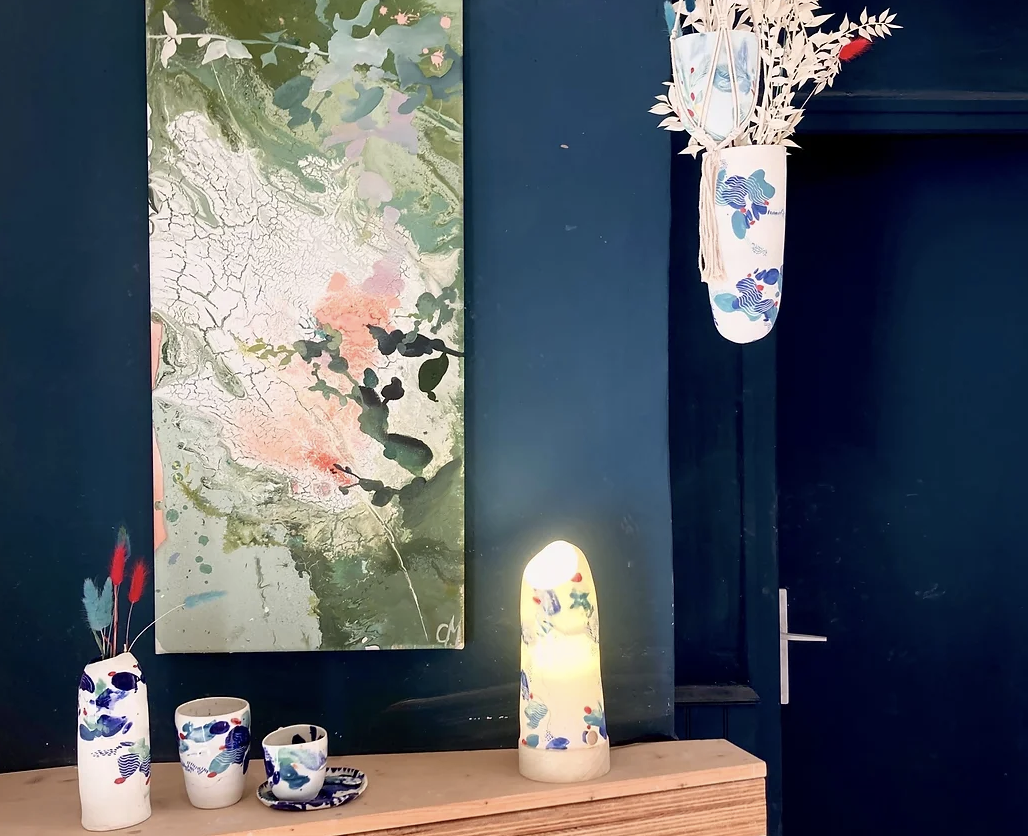 L'atelier présente également une seléction d'oeuvres picturales, des toiles aux couleurs vives ou pastels sous le thème de la nature. Vous découvrirez aussi un travail autour de l'aménagement intérieur en céramique, notamment des luminaires, des tables et des claustras en terre, métal et bois.