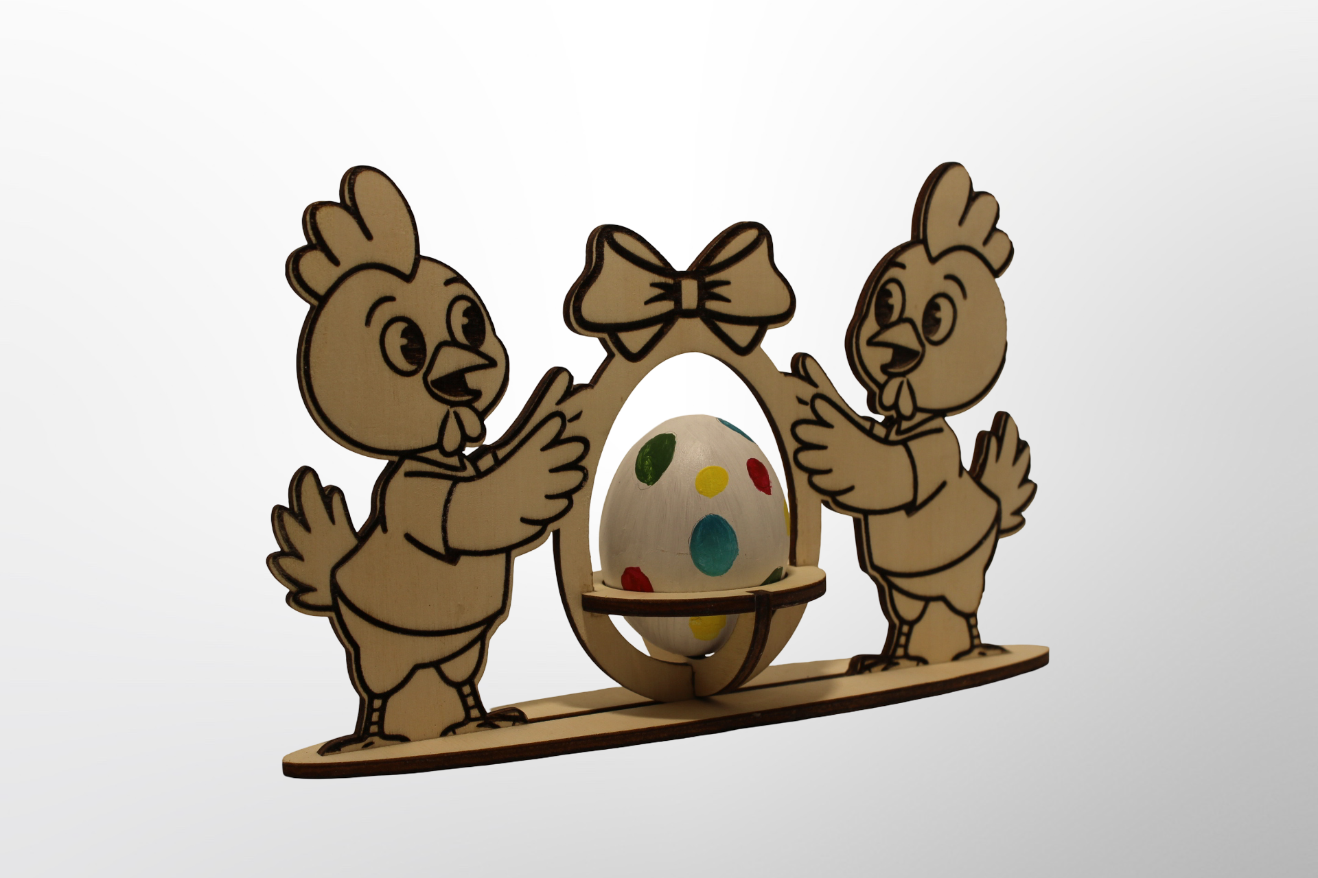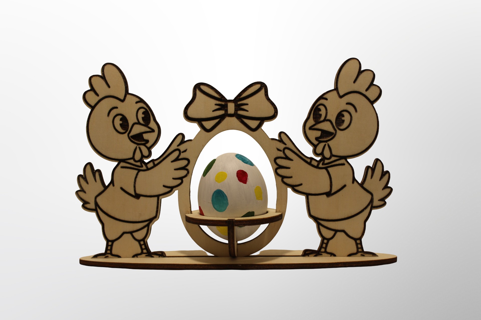 Apportez une touche de douceur et de convivialité à votre décoration de Pâques avec cette jolie scène en bois représentant deux poules entourant un œuf. Finement découpé et gravée, cette création met en valeur le charme naturel du bois et un design ludique qui gravira petits et grands.